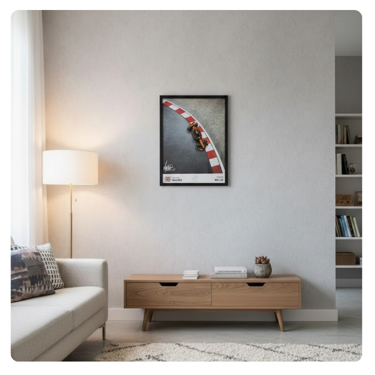 Incluye un modelo McLaren a escala 1:43, cuidadosamente seleccionado para acompañar la obra y elevarla a un nivel verdaderamente coleccionable. No es solo un cuadro: es una experiencia visual que une arte y pasión por la Fórmula 1.
